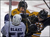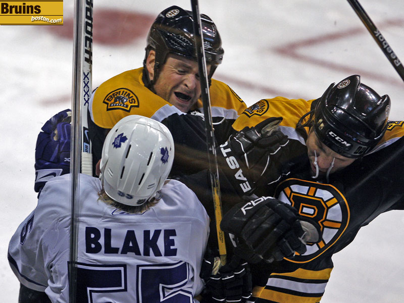 Bruins Aaron Ward (left) and Shawn Thornton team up to staple Toronto's Jason Blake to the boards. (Globe Staff Photo / Jim Davis)