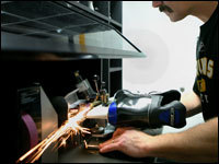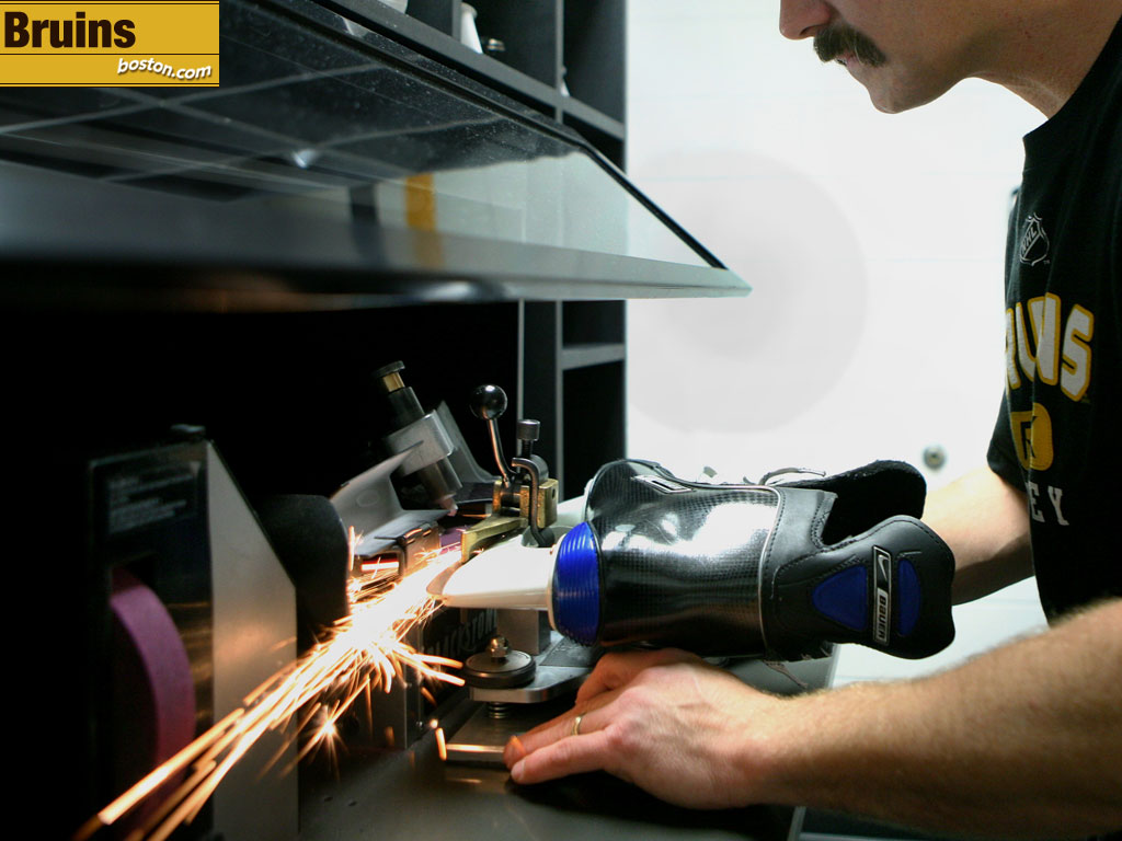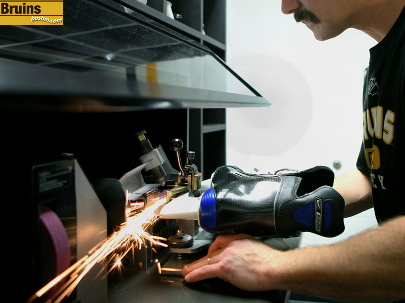 Sparks fly as Bruins equipment manager Mark Dumas sharpens skates before a 7 p.m. home game against the Montreal Canadiens. (Globe Staff Photo / Wendy Maeda)
