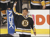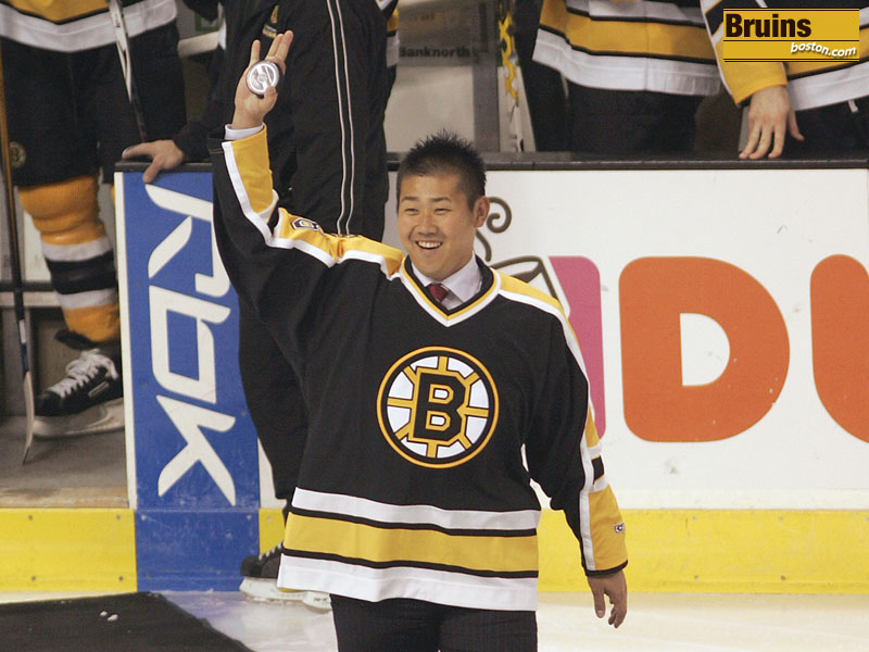 Red Sox ace Daisuke Matsuzaka waves to the crowd before dropping a ceremonial puck prior to a Bruins/Devils game. (Globe Staff Photo / Evan Richman)