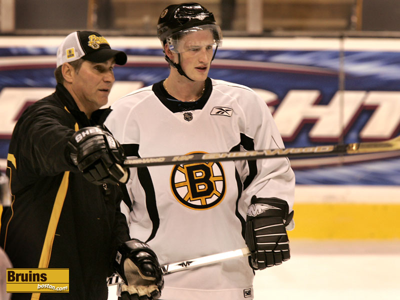 Former Bruin great and Hall of Famer Raymond Bourque gave some tips to Brad Boyes at practice. (Globe Staff Photo / Barry Chin)