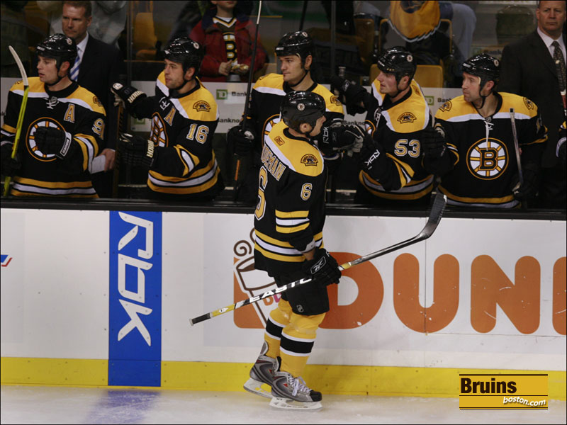 Dennis Wideman (6) celebrates with Marc Savard (91) after Wideman scored a goal. (Globe Staff Photo / Barry Chin)