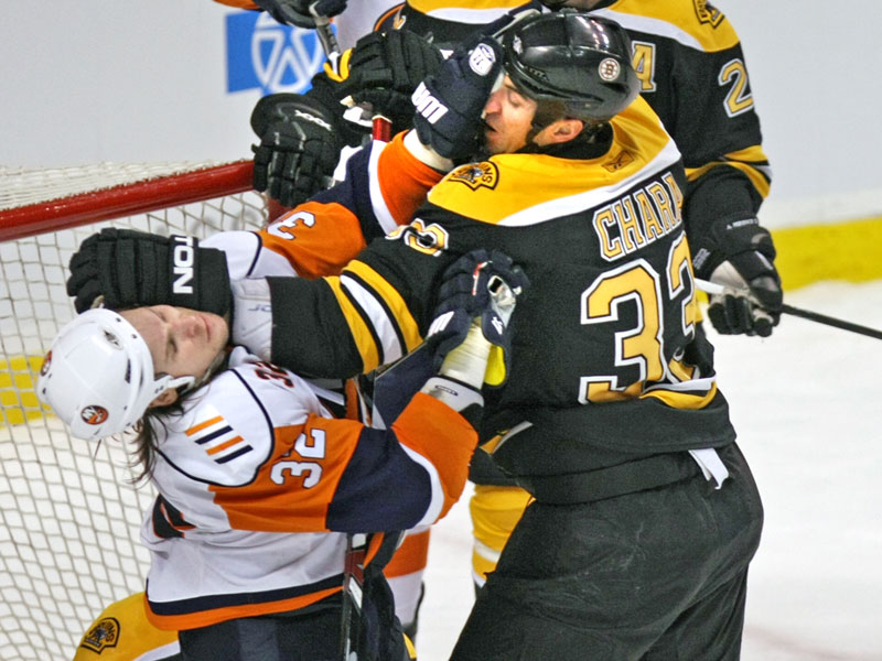 Zdeno Chara defended his turf against Brendan Witt (32) of the Islanders during third period action. (Globe Staff Photo / Justine Hunt)