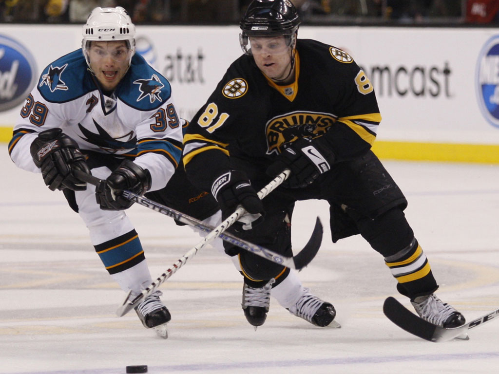Phil Kessel (right) and Tomas Plihal of the San Jose Sharks battle for control of the puck. (Globe Staff Photo / Matthew J. Lee)